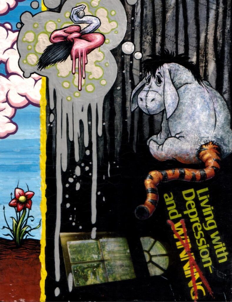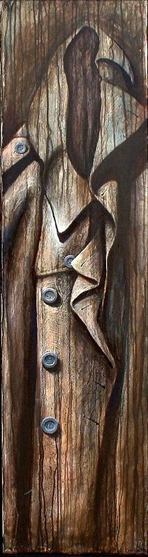 “Roots” – Acrylic on Board – 36×24″ SOLD“Medicated” – Acrylic on Book Cover – 12×8″ SOLD“Waiting” – Oil on Canvas – 24×36″ SOLD“Rain Jacket” – Oil on Canvas – 40×16″ SOLD