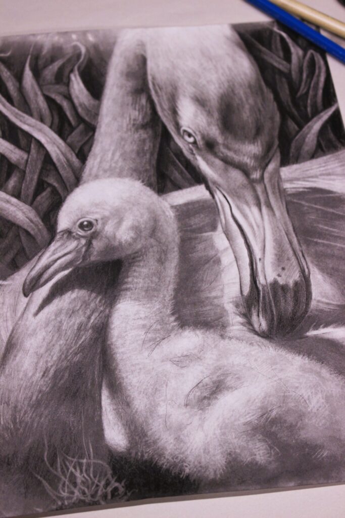 “Roots” – Acrylic on Board – 36×24″ SOLD“Nesting” – Graphite on Paper – 14-10″ SOLD“Medicated” – Acrylic on Book Cover – 12×8″ SOLD“Waiting” – Oil on Canvas – 24×36″ SOLD“Rain Jacket” – Oil on Canvas – 40×16″ SOLD